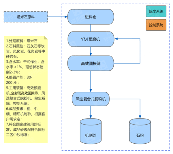 主用装备瓜米石低制粉全筛分超细破碎机,是专门针对瓜米石等低动能、低产率、磨损较大的小骨料制砂,在现有预磨机的基础上改良升级的新一代专用整形破碎机。设备采用立式结构,分级破碎工作方式。