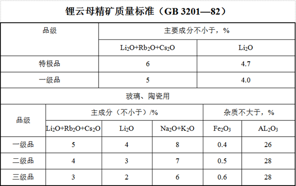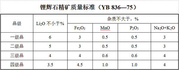 (2)按化学成分锂辉石精矿分为四级,以干矿品位计算。