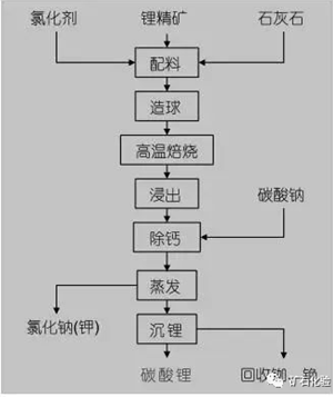 氯化焙烧法主要是采用氯化剂(氯化钙)使锂矿石中的锂及其他有价金属转化为氯化物,分为中温氯化和高温氯化两种工艺。