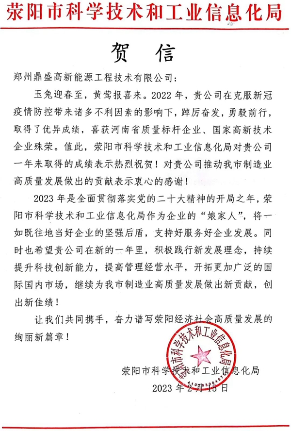 2月15日,荥阳市科学技术和工业信息化局向郑州888集团welcome大厅高新能源工程技术有限公司(以下简称“郑州888集团welcome大厅”)发来贺信。向公司过去一年取得优异成绩表示祝贺,恭贺郑州888集团welcome大厅喜获河南省质量标杆企业、国家高新技术企业等殊荣。对郑州888集团welcome大厅推动荥阳市制造业高质量发展做出的贡献表示感谢。