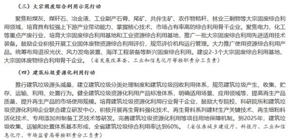 ——鼓励大宗固废综合利用、建筑垃圾资源化利用,建设2-3个大宗固废综合利用基地、大宗固体废物综合利用骨干企业,全省建筑垃圾综合利用率达到60%。