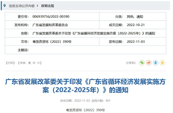 近日,广东省发展改革委印发《广东省循环经济发展实施方案(2022-2025年)》(以下简称方案),对广东省大力发展循环经济,推进资源节约集约利用,构建资源循环型产业体系和废旧物资循环利用体系,对保障资源安全,推动实现碳达峰、碳中和,促进生态文明建设具有重大意义。