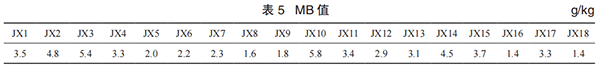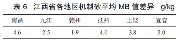 由表 5、表 6 和图 6、图 7 可以看出:江西省内机制砂 MB 值平均值为 3.1g/kg,已显著高于国家标准 GB/T 14684—2011《建设用砂》中砂的 MB 值不得大于 1.4g/kg 的指标。南昌地区平均 MB 值为 4.6g/kg,显著高于江西省内机制砂平均 MB 值,MB 值离散较大。九江地区平均 MB 值为 2.5g/kg,低于江西省内机制砂 MB 值平均值,但依然高于国家标准规定值,离散较小。赣州地区平均 MB 值为 1.9g/kg,显著低于江西省内机制砂 MB 值平均值,但依然高于国家标准规定值,离散较小,为所选地区中 MB 值平均值最低。抚州地区平均 MB 值为 4.0g/kg,显著高于江西省内机制砂 MB 值平均值,离散大。上饶地区平均 MB 值为 3.8g/kg,高于江西省内机制砂 MB 值平均值,且所有样品 MB 值均高于江西省内机制砂 MB 值平均值,离散较大。宜春地区平均 MB 值为 2.0g/kg,显著低于江西省内机制砂 MB 值平均值,但依然高于国家标准规定值。但宜春区域所选机制砂中,两个样品符合国家标准 GB/T 14684—2011《建设用砂》中砂的 MB 值不得大于 1.4g/kg 的指标,因其离散大,造成平均 MB 值偏高。