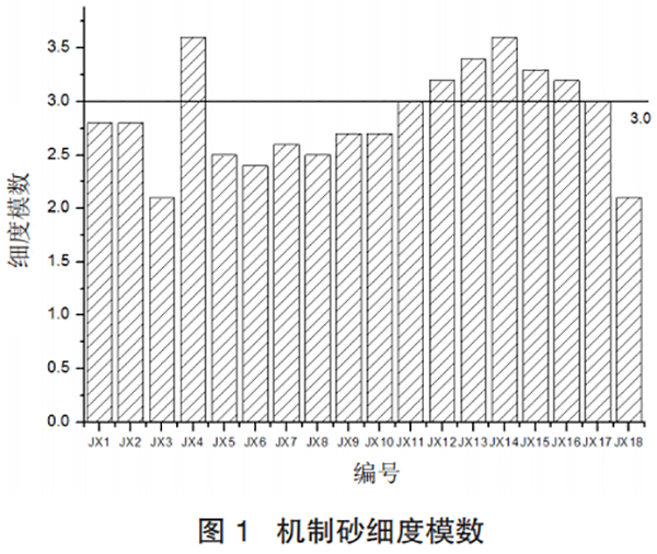 1、机制砂物理性能分析本次市场调研主要从收集到江西南昌(编号 JX1、JX2、JX3)、九江(编号 JX4、JX5、JX6)、赣州(编号 JX7、JX8、JX9)、抚州(编号 JX10、JX11、JX12)、上饶(编号 JX13、JX14、JX15)、宜春(编号 JX16、JX17、JX18)6 个地级市的样品中选取有代表性的 18 种机制砂样品进行分析,其中分析的指标主要有:细度模数、石粉含量、MB 值、堆积密度和压碎值指标。