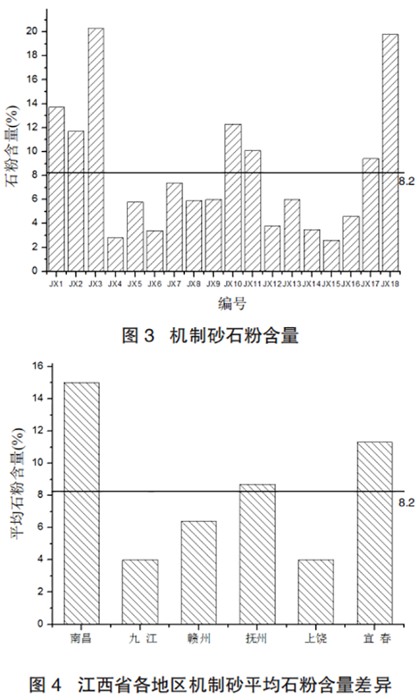 由图表 3 和 4 可以看出:江西省地区机制砂平均含粉量为 8.2%。其中九江、赣州、上饶地区机制砂石粉含量相对稳定,离散较小。南昌、抚州、宜春地区机制砂石粉含量相差较大,离散较大。从各个地区分析,南昌地区平均石粉含量为 15.0%,显著高于江西省地区石粉含量平均值,且所取的单个机制砂石粉含量均高于省内机制砂石粉含量平均值。九江地区石粉含量为 4.0%,显著低于省内机制砂石粉含量平均值,且石粉含量相对稳定。赣州地区石粉含量为 6.4%,低于省内机制砂石粉含量平均值,但其石粉含量普遍高于九江地区。抚州地区石粉含量为 8.7% 与省内机制砂石粉含量平均值相近,其机制砂石粉含量分布区间较广,高于或低于省内机制砂石粉含量平均值的石粉含量均存在。上饶地区石粉含量为 4.0%,显著低于省内机制砂石粉含量平均值,与九江地区石粉含量相当。宜春地区平均石粉含量为 11.3%,显著高于江西省地区石粉含量平均值,其机制砂石粉含量分布区间较广,高于或低于省内机制砂石粉含量平均值的石粉含量均存在,在所取机制砂 6 个区域中机制砂石粉含量离散最大。