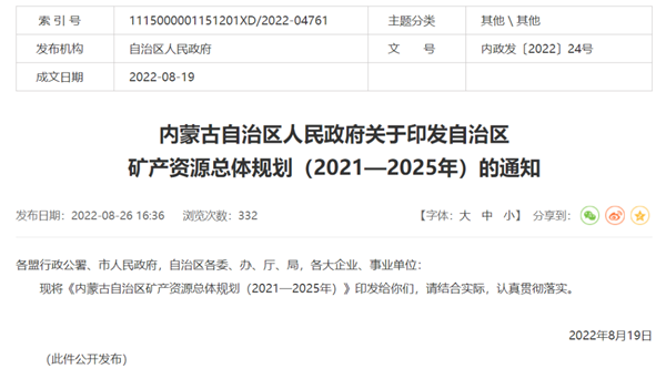 近日,内蒙古自治区人民政府印发《内蒙古自治区矿产资源总体规划(2021—2025年)》,提出到2025年,重要矿产的供应保障体系更趋完善,勘查开发区域布局更趋合理,矿产资源勘查开发与环境保护更加协调,基本形成绿色勘查开发新格局。